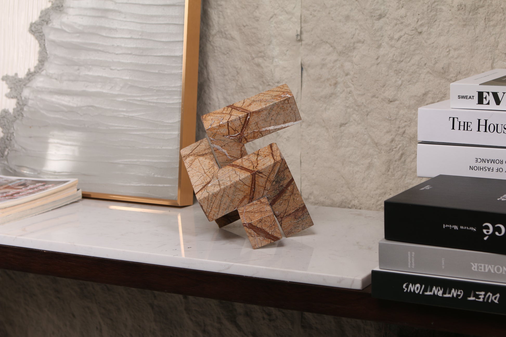 Elevate your living space with the Geometric Interlocking Marble Sculpture, a striking statement piece that effortlessly blends modern elegance with timeless appeal. Its intricate design of interlocking shapes creates a captivating focal point, perfect for enhancing entryways, consoles, shelves, or side tables. Crafted with precision, this sculpture adds depth and sophistication to any room, while its clean lines and bold form complement a variety of décor styles. It strikes the ideal balance between subtlety and presence, making your home feel both curated and welcoming. Experience the refined luxury that only Mayaze brings to your space.